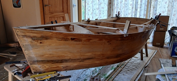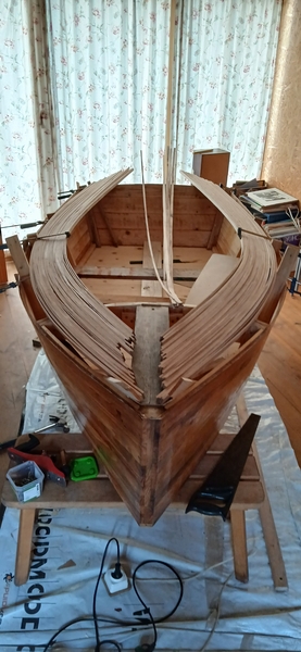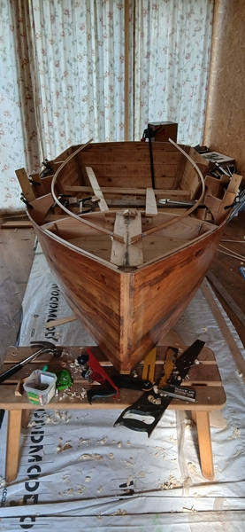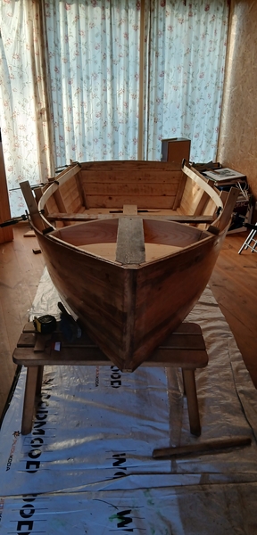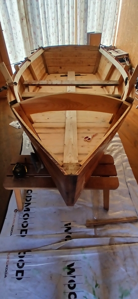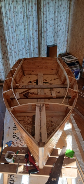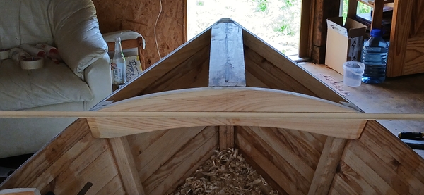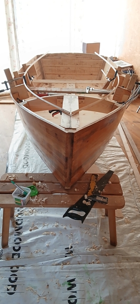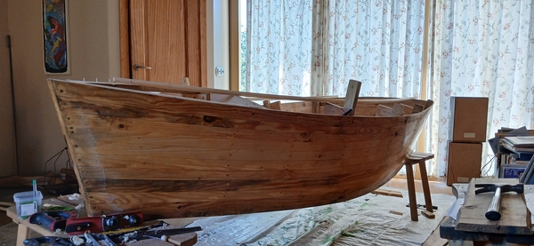 The keelson material itself is a salvaged piece of weatherboard (spruce?) from a dog shed I demolished a few years ago (that I had built some years before that). I have another one of correct length waiting and that will become the partnering keel on the bottom outside.