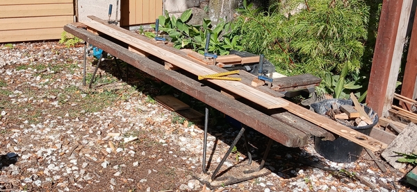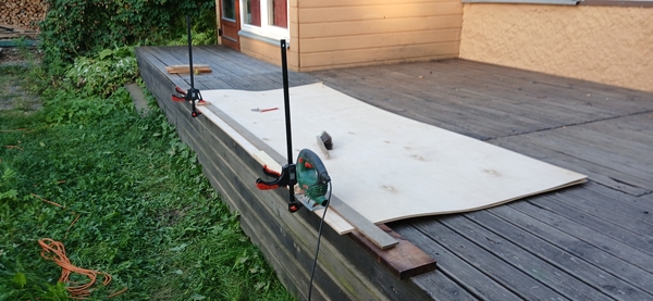 Taking advantage of the early-September nice weather there were a couple of tasks I wanted to accomplish before the weather goes all bad - prepare the keelson which is the long plank in the bottom of the boat running from aft (the transom) to fore (the stem), and prepare the decking plywood strips. Since I have no fancy equipment, but I am armed with a circular saw and a simplistic planer / thickness machine, my rig for sawing things to size is a… yard bench, clamp screws, and a long batten for saw guide.